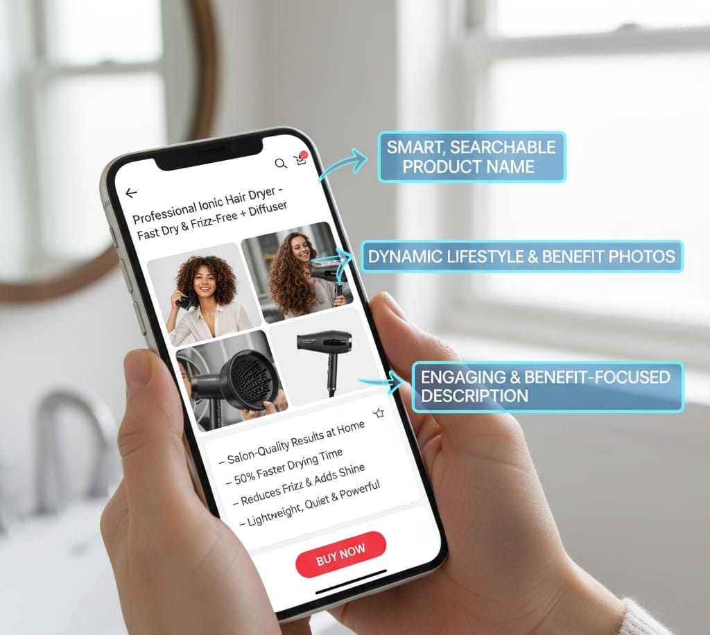 - High-Impact Images: Every image should serve a purpose — showing usage, key benefits, or lifestyle context to drive purchase intent.